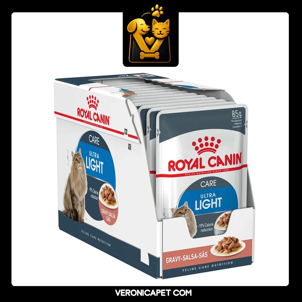 غذای پوچ کاهش وزن یا Ultra Light اولترا لایت گروی رویال کنین برای گربه های بالغ همه نژادها قابل استفاده است. این محصول 19% کالری کمتری دارد.