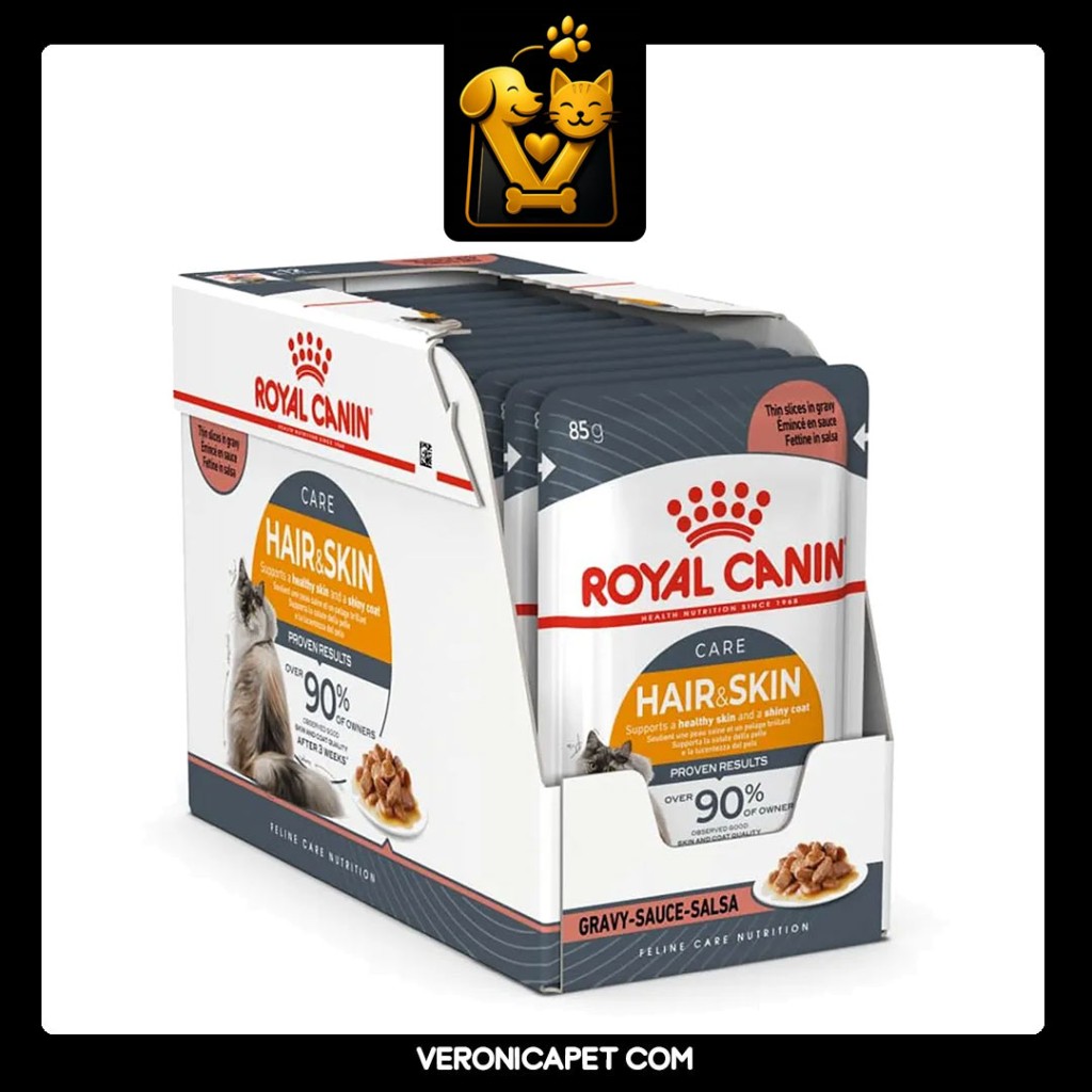 یکی از غذاهای کامل و مغذی که برای تقویت و مراقبت از پوست و موی گربه ها تولید شده، غذای پوچ هیر اند اسکین ژله ای رویال کنین است. این محصول فرمولاسیونی کامل و متعادل دارد و انواع مواد مغذی مورد نیاز برای تقویت مو را در خود جای داده است. از جمله این ترکیبات می توان به اسیدهای چرب امگا 3 شامل EPA و DHA اشاره کرد. همچنین حاوی اسیدهای چرب امگا 6، انواع ویتامین ها و مواد معدنی ضروری می باشد.