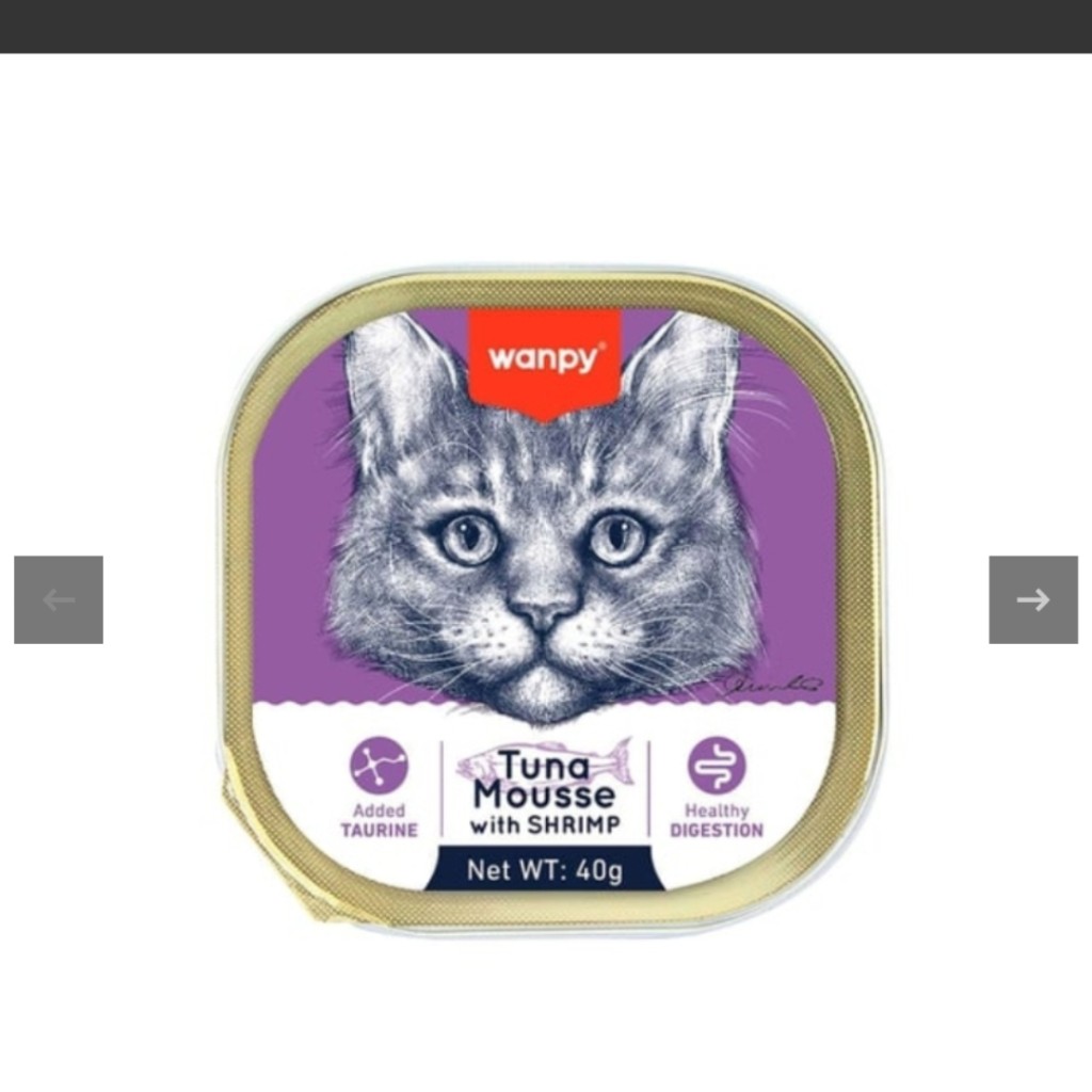 | مشخصات محصول | وزن 40 گرم گونه حیوان گربه طعم ماهی تن و میگو نوع کنسرو Mousse برند Wanpy کشور سازنده چین |