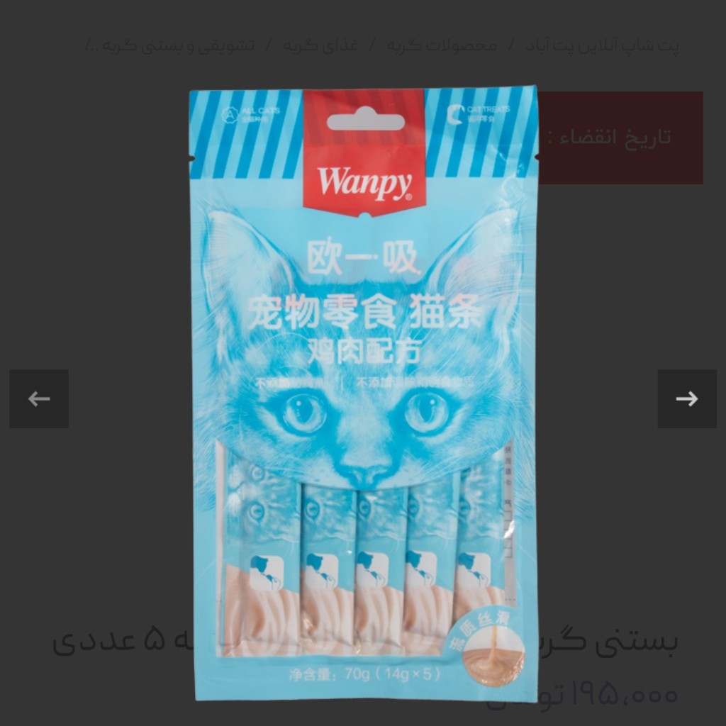 | مشخصات محصول | ابعاد هر عدد ۲×۳×۱۶ سانتیمتر وزن هر عدد ۱۴ گرم گونه حیوان گربه تعداد در بسته ۵ عدد پروتئین ۶.۵% چربی ۰.۰۲% برند Wanpy کشور سازنده چین |