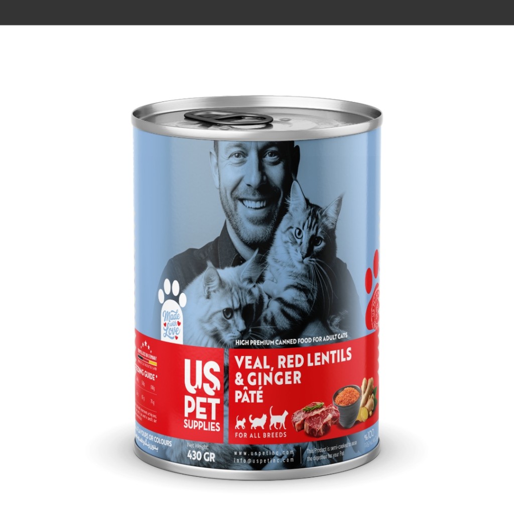 کنسرو غذای گربه یو اس پت مدل های پریمیوم با طعم گوساله و عدس قرمز و زنجبیل وزن 800 گرم