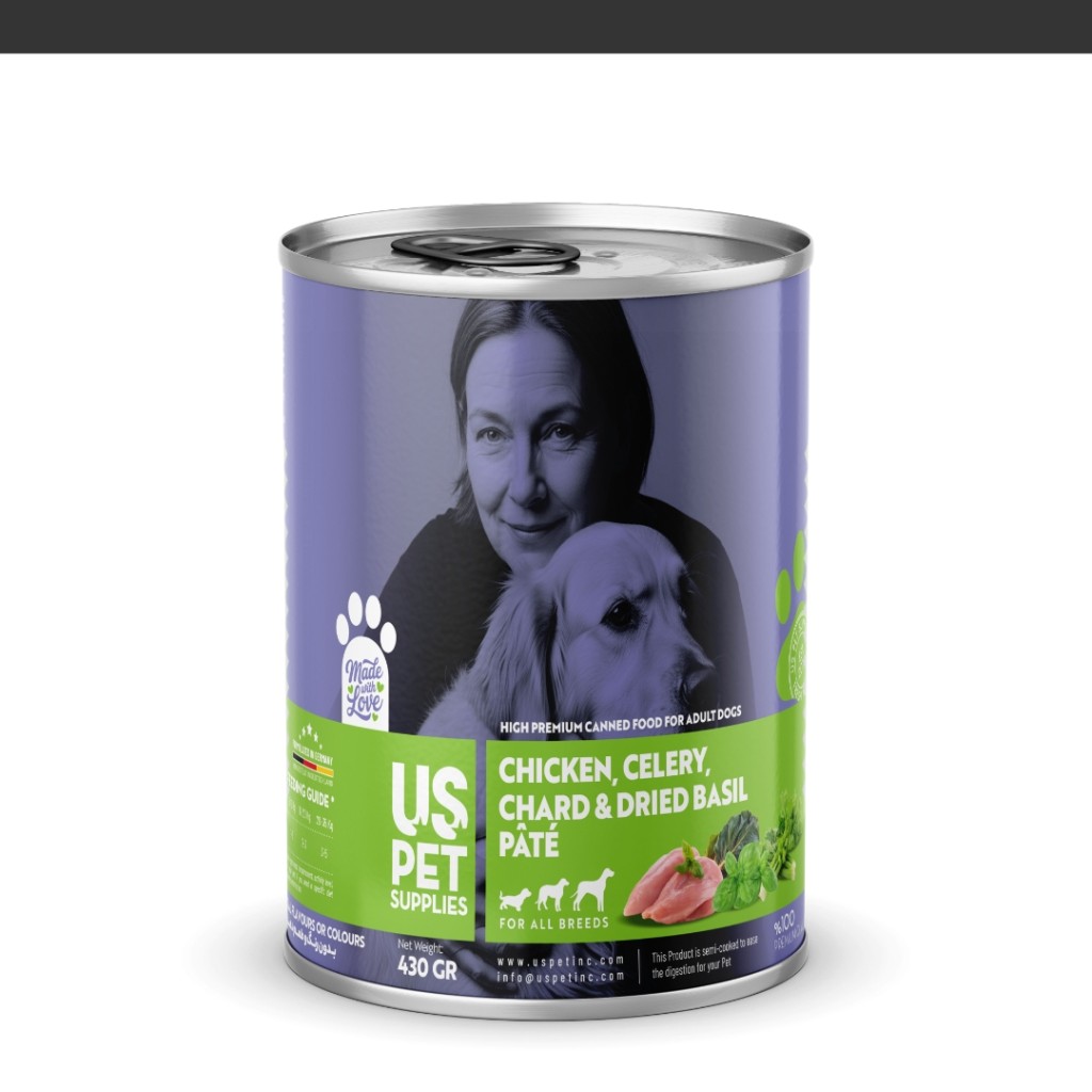 کنسرو غذای سگ یو اس پت مدل های پریمیوم با طعم مرغ کرفس، زغال اخته و ریحان وزن 430 گرم